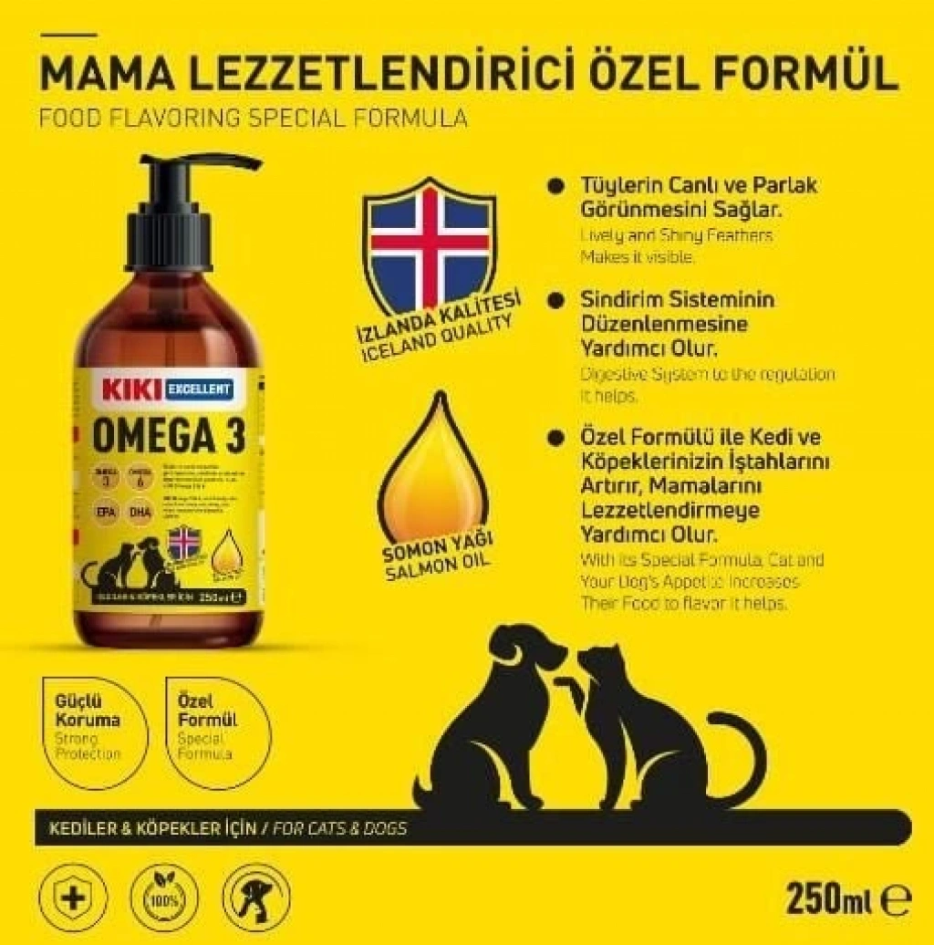 KIKI Excellent Kedi & Köpek Omega 3 Özel formülü ile kedilerin ve köpeklerin iştahlarını arttırmaya, mamalarını lezzetlendirmeye yardımcı olur.