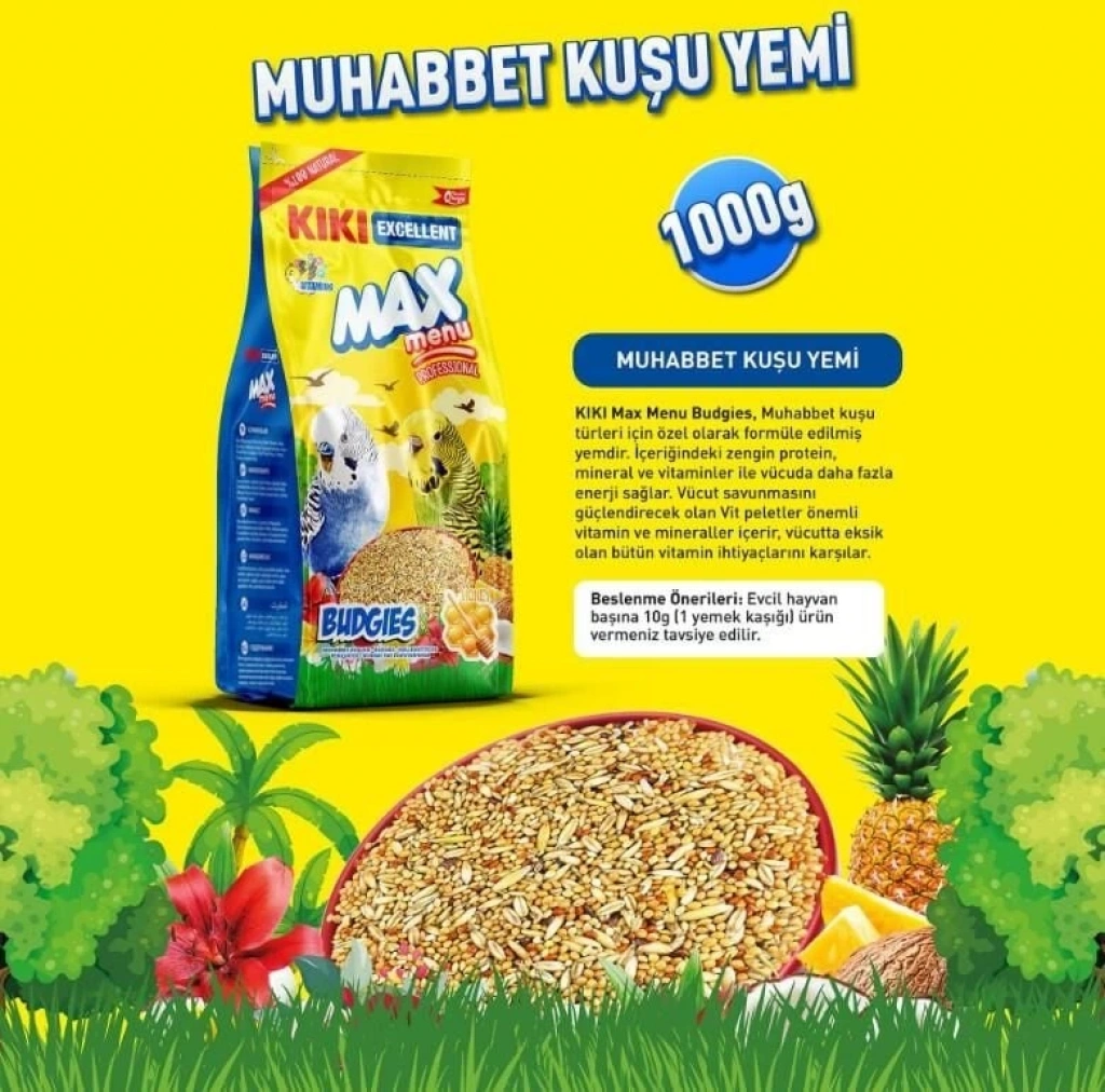 KIKI Max Menu Budgies, Muhabbet kuşu türleri için özel olarak formüle edilmiş yemdir. İçeriğindeki zengin protein, mineral ve vitaminler ile vücuda daha fazla enerji sağlar. Vücut savunmasını güçlendirecek olan Vit peletler önemli vitamin ve mineraller içerir. Vücuttaki eksik vitamin ve minerallerin tamamlanmasına yardımcı olur.