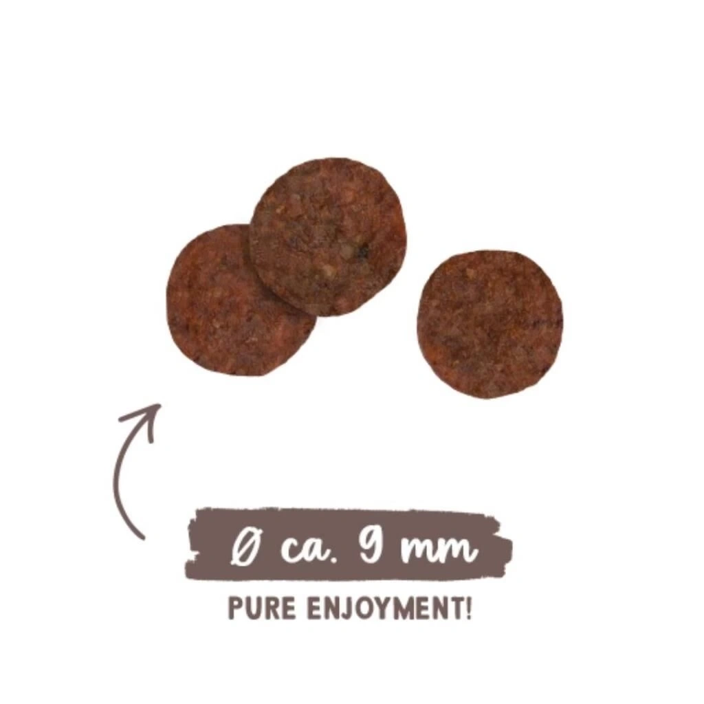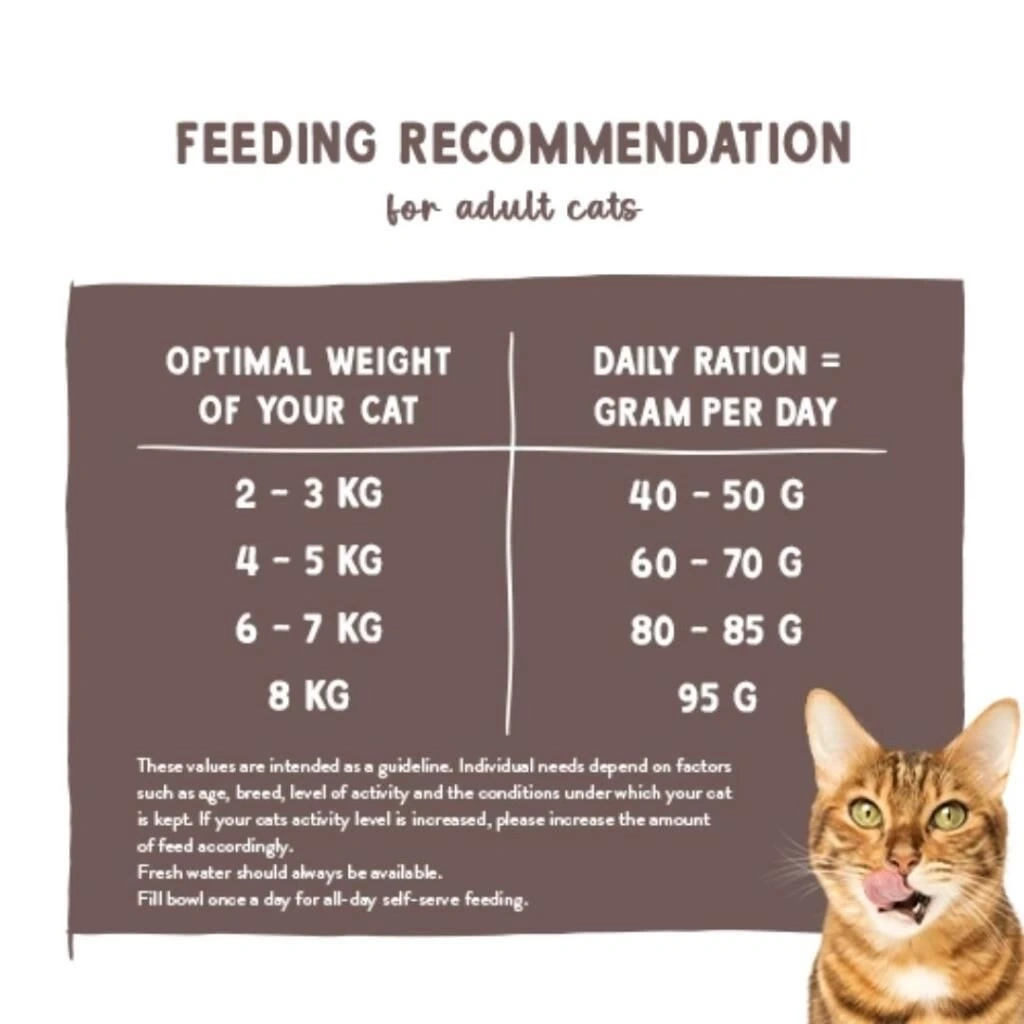 Kanatlılardan elde edilen et (taze 20 %), kümes hayvanları proteini (kurutulmuş), pirinç, pirinç unu, hayvansal yağlar, taze kuzu eti (5 %), taze ciğer (5 %), ciğer unu, protein hidrolizat, rendelenmiş kuru pancar (şekeri alınmış), patates proteini, keten tohumu, bezelye lifleri, somon balığı yağı, kalsiyum karbonat, tam yumurta (kurutulmuş), balık unu, bezelye (kurutulmuş, 0,4 %), maya (kurutulmuş, dahil. 0,1 % mananoligo sakkarit, 0,06 % β glukan), potasyum klorür, kırmızı yaban mersini (kurutulmuş, 0,1 %), yaban mersini (kurutulmuş, 0,1 %), yeşil dudaklı istridyeler (kurutulmuş), aynı safa çiçeği (kurutulmuş), hindiba tozu, kurutulmuş yuka bitkisi.